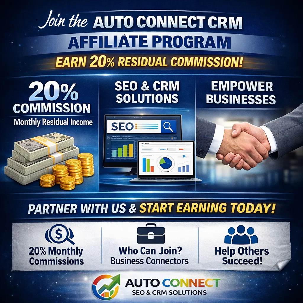 You’re referring businesses to Auto Connect CRM’s SEO and all-in-one CRM platform, which generates leads, manages follow-ups, and helps businesses grow.