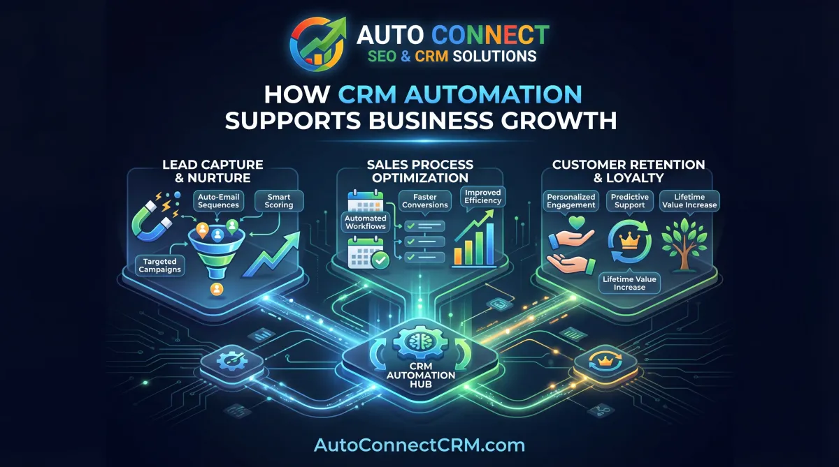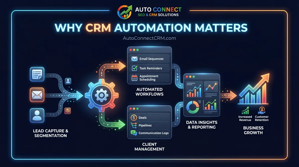 AutoConnect CRM helps businesses implement automation systems that track leads, improve communication, and increase sales performance.