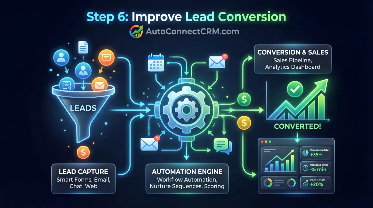 A practical CRM automation guide explains how automation improves lead conversion rates by ensuring that every inquiry receives a response.