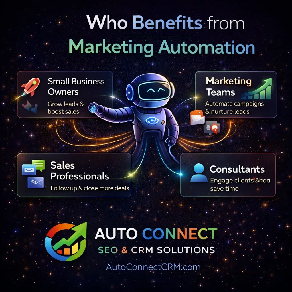 Who Benefits from Marketing Automation Many industries benefit from implementing marketing automation for small businesses. Businesses that rely on consistent customer inquiries and follow-up communication can significantly improve efficiency through automation systems. Industries that commonly benefit include: • service-based businesses • contractors and home service companies • automotive businesses • marketing agencies • fitness and wellness providers • professional services Any company that manages leads and customer inquiries can benefit from implementing CRM marketing automation tools.