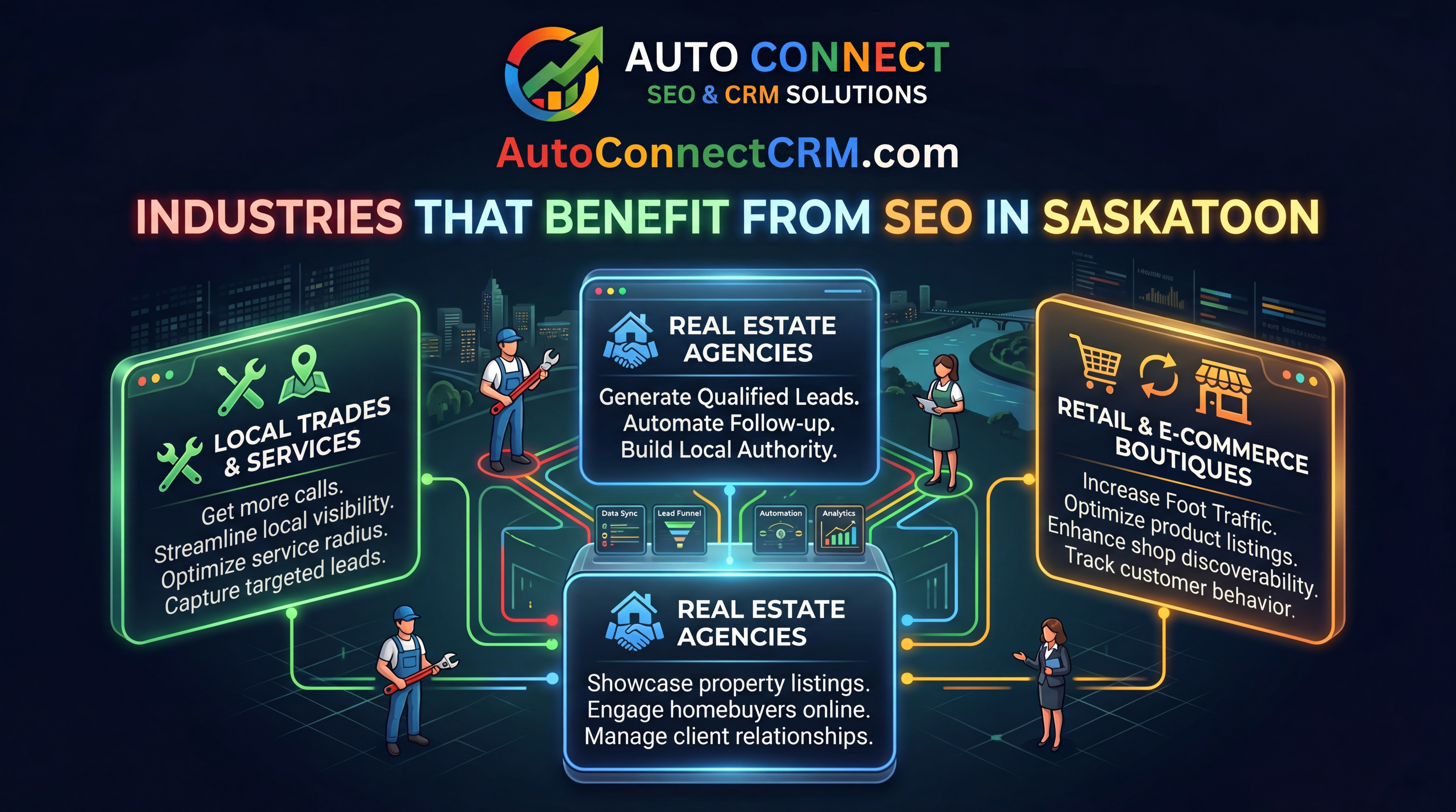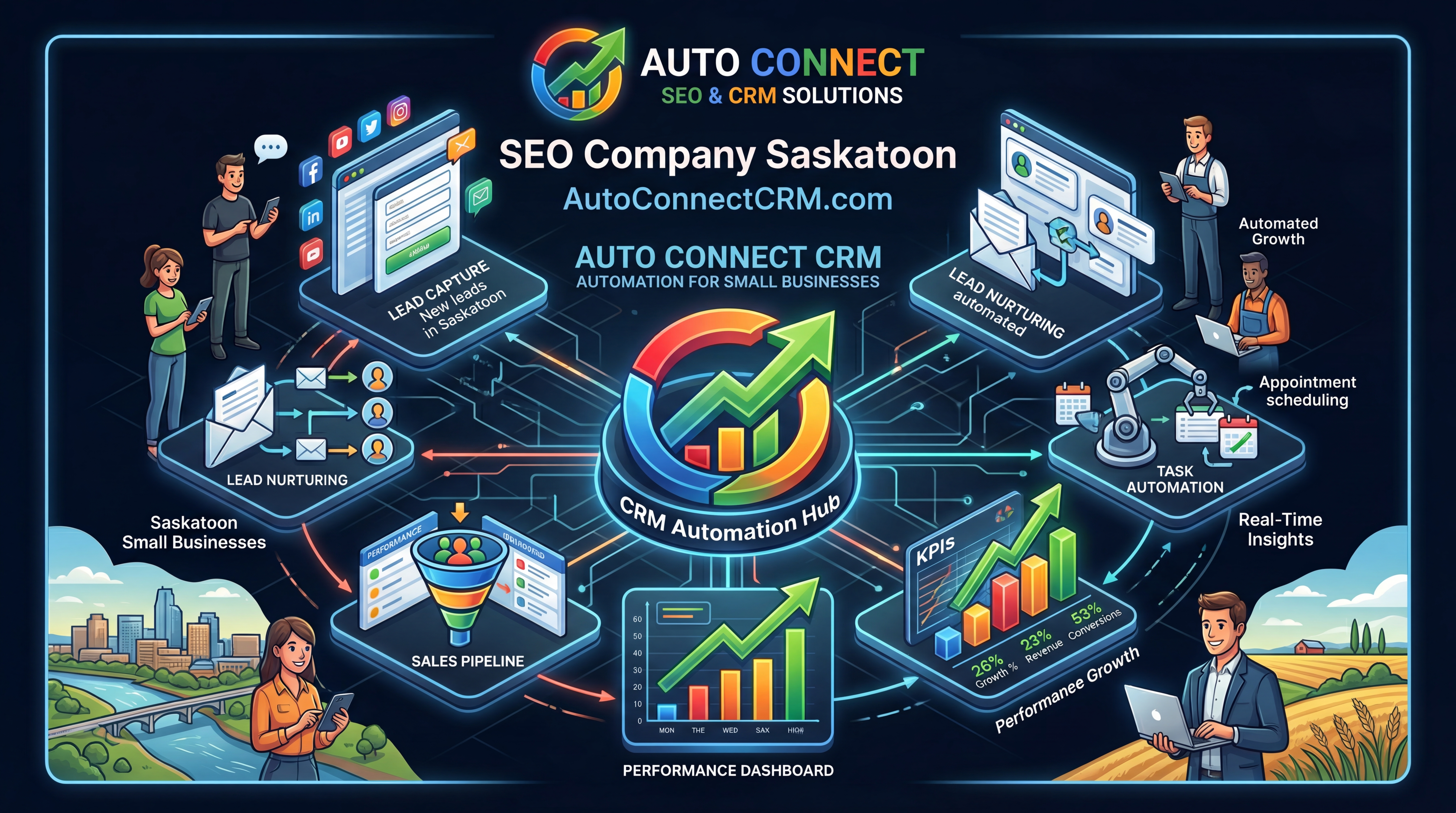 AutoConnect CRM partners with Saskatoon businesses to improve search visibility, generate quality leads, and create automation-backed follow-up systems that close more opportunities.
