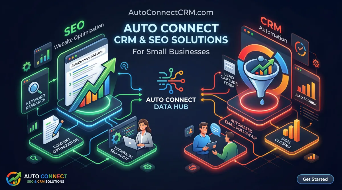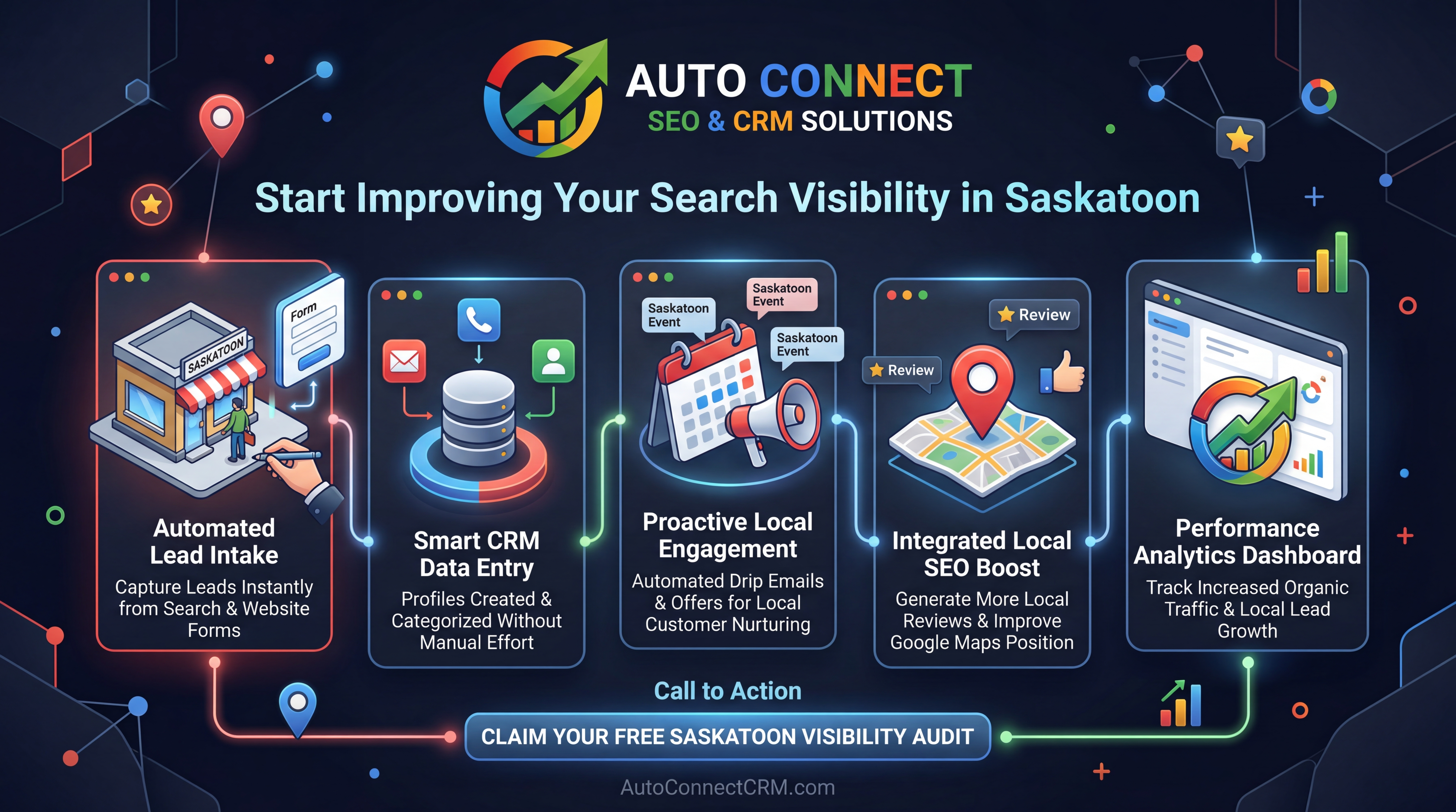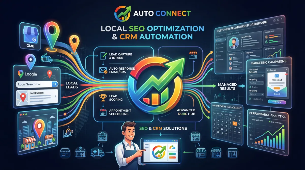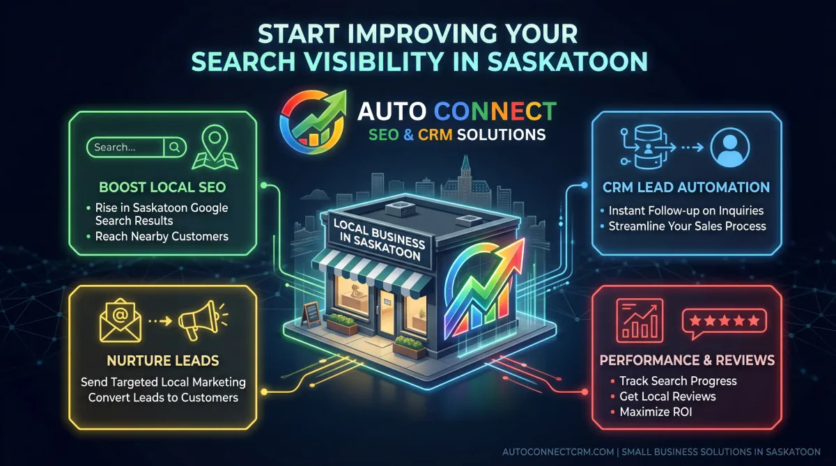 AutoConnect CRM helps Saskatoon businesses improve search visibility, generate leads, and manage customer inquiries through integrated marketing systems.