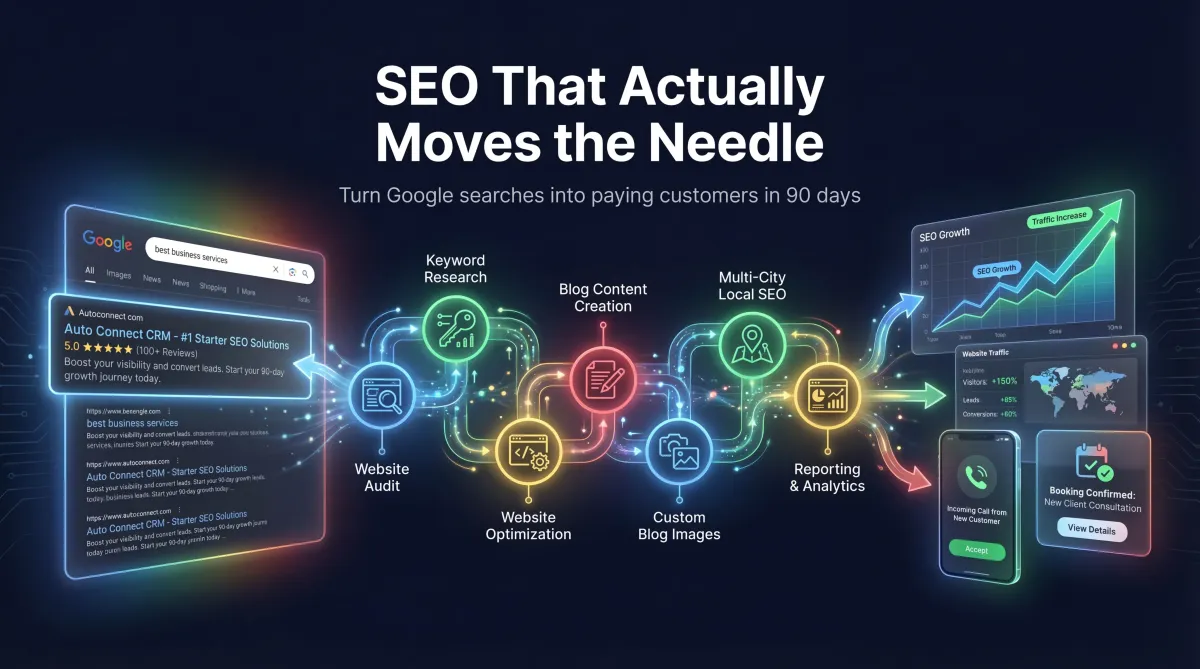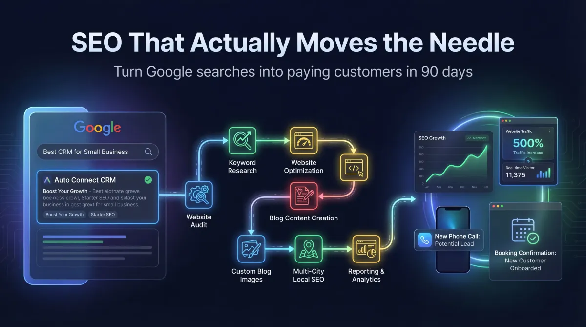 We lock in high-intent keywords, clean up your site structure, tune your Google Business Profile, and publish conversion-focused content.