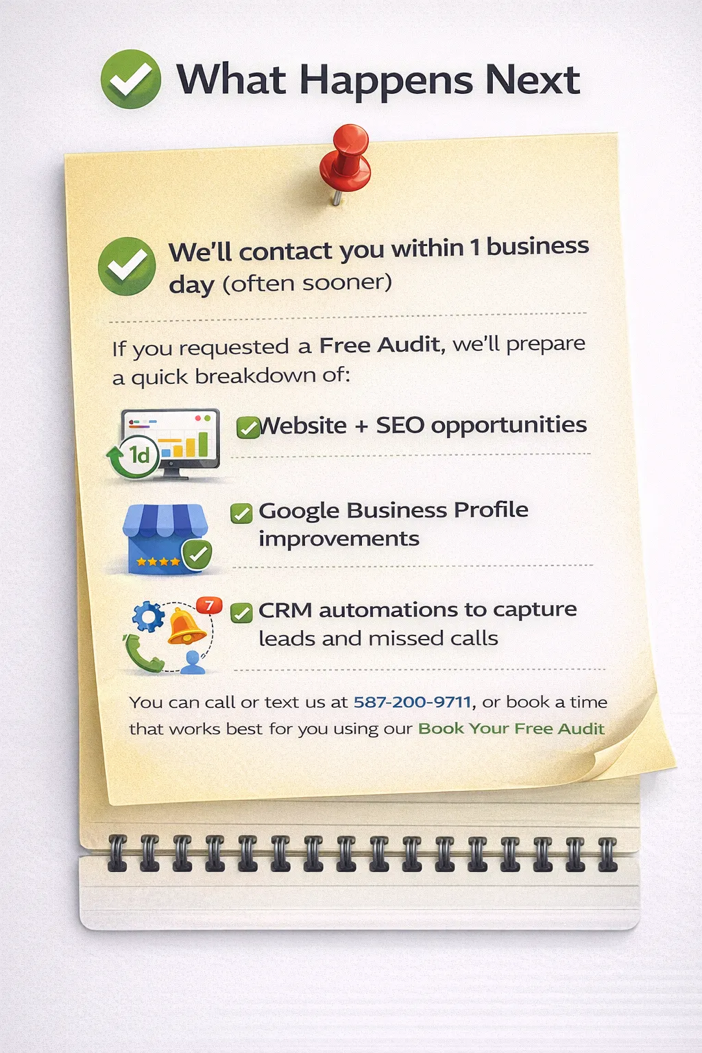 We’ll contact you within 1 business day (often sooner). If you requested a Free Audit, we’ll prepare a quick breakdown of your website and SEO opportunities, Google Business Profile improvements, and the CRM automations that can help you capture more leads and missed calls.