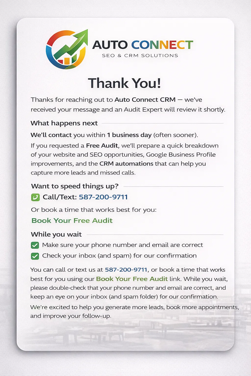 Thanks for reaching out to Auto Connect CRM — we’ve received your message and an Audit Expert will review it shortly.
